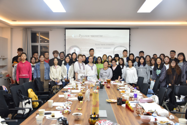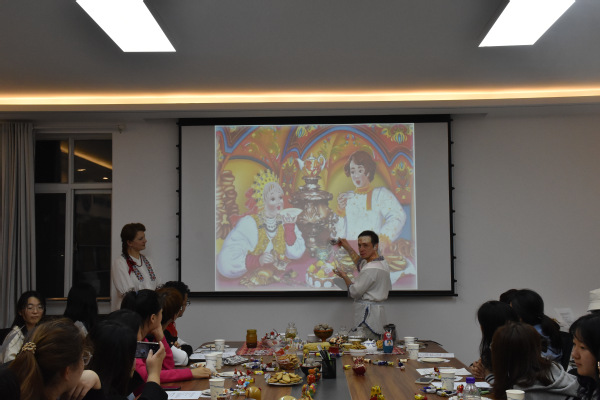 在俄语角上,借助精心准备的PPT和俄罗斯动画片,外教Олег为大家详细介绍了俄罗斯茶文化的起源、中俄茶文化的差异和茶的种类等,讲解过程生动有趣,同学们热情高涨,笑声不断。美味的果酱、酥脆的饼干、甜而不腻的巧克力也让同学们在品味美食的同时,更直观地了解了俄罗斯的茶文化。