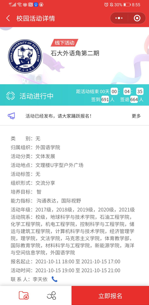 10月15日晚,2021-2022-1学年第二期“石大外语角”于文理楼U形户外广场和文理楼346举办。本期活动由研究生外语教学部、俄语语言文学系和院团委主办,英语1902班及俄语1902班承办,以 “Measures to Battle Big City Disease”与“中俄茶道文化趣谈”为活动主题,英语口译专业2021级硕士研究生李盈英、英语专业2019级本科生徐艺甜和俄语专业2019级本科生段和煦分别担任主持人,研究生外语教学部、俄语系部分教师,外教David、Neville参与指导,通过校团委“石光”系统报名参与本期活动的学生有691人。