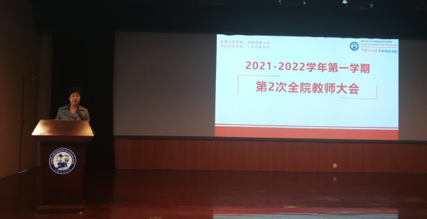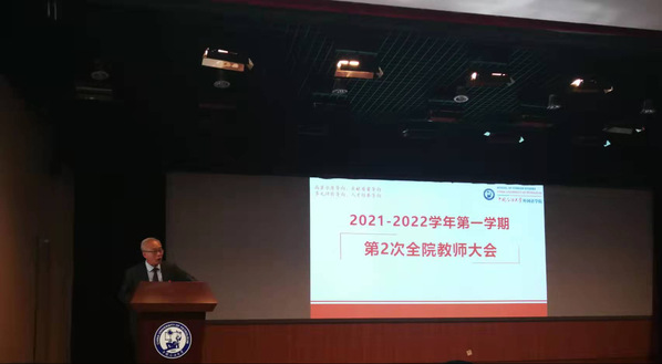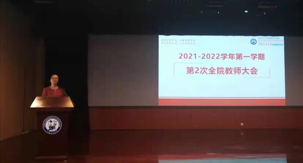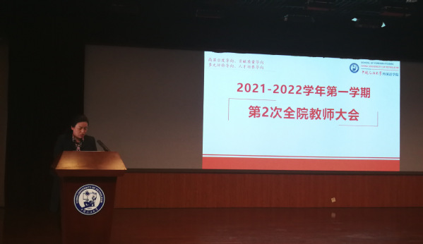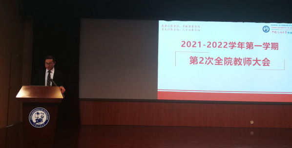 毛浩然院长从“贡献导向、质量导向、高显示度导向、多元评价导向、人才培养导向、学科建设导向”切入,引领全体教师更新观念、抓大放小、求同化异、与时俱进、走上坡路、不走极端,实现教学与科研并重,专业与公外齐飞。他希望大家直面真问题,以系统性全局化的思维做好教学团队、课程团队和科研团队建设。在比对去年和今年仅仅相隔一年时间欧冠毕业生本科教育满意度各项指标所实现的翻天覆地变化的基础上,尤其是有四项指标实现了从全校倒数第一变成全校第一,强调“一切皆有可能,用心无所不能”“以实力赢尊重,以贡献求支持”,以翔实数据鼓舞了全院教师的士气。毛浩然院长还解读了学院教师高级职称评审申请报告和学院领导及院属各单位年度重点工作,对两份拟报送学校的岗聘新文件进行了详细说明。经全院教师表决,这两份新文件获得了高票通过。