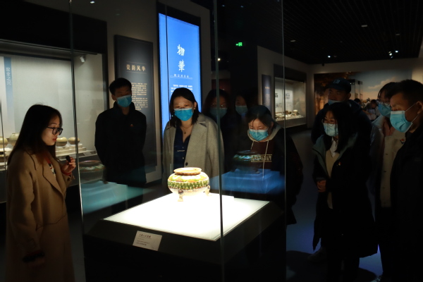 在讲解员的带领下,师生党员分为两组进行参观与学习,重点参观了“文韵齐鲁—山东大学文物考古成果展”和“百年学府——山东大学校史展”。在“文韵齐鲁”展厅,大家沉浸在齐鲁文化的氛围中,领略了从大汶口文化的起源到秦皇汉武的风采,从石器时代的简单生产工具到明清色彩斑斓的手工业品等厚重的齐鲁文化。