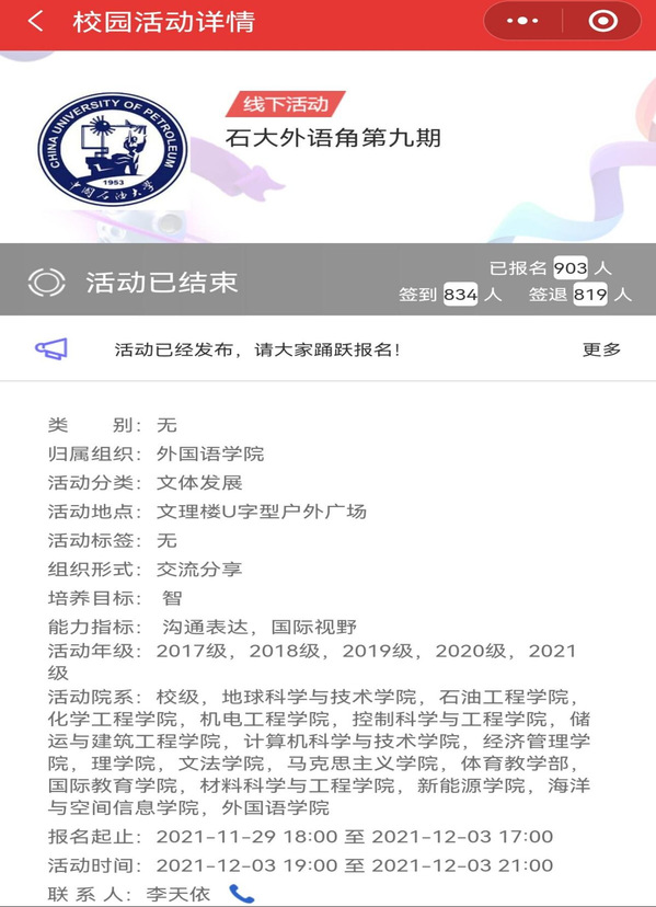 12月3日晚,2021-2022-1学年第九期“石大外语角”在文理楼U形户外广场和文理楼344举办。本期活动由学术英语系、俄语语言文学系和欧冠直播官网团委主办,英语2103班及俄语2102班承办,以“The Impact of Vocabulary Apps or Websites on Vocabulary Building”与“法语学习中的苦与乐”为活动主题,英语专业2021级本科生王心怡与英语专业2021级口译硕士研究生高明担任本期活动主持人。学术英语系、俄语系部分教师,外教David和Neville参与指导,来自全校各专业师生自由参与,共计834人参加本次活动。