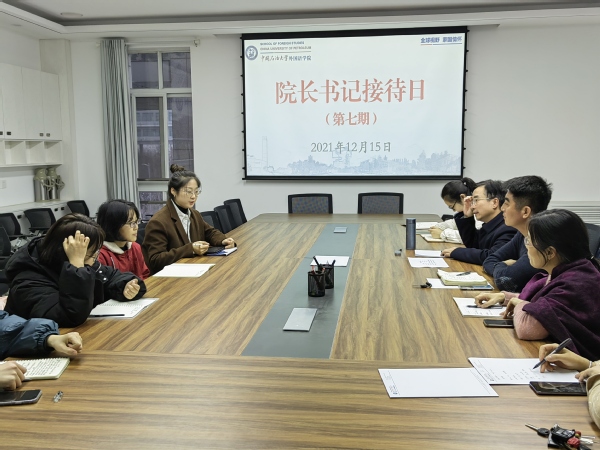 2021年12月15日下午四点,欧冠直播官网开展第七期“院长书记接待日”活动。欧冠直播官网毛浩然院长,党委张炜书记,英语语言文学系李燕云主任,俄语语言文学系赵婷廷主任,研究生教育办公室徐小雁主任,团委书记相欣余老师等共同参加了接待活动,与本科生和研究生代表进行了深入的交流。针对欧冠学代会集中反应的问题和研究生会提出的问题为大家解疑答惑。院长和书记逐一详尽解答了学院和学校在学习硬件改善方面所做的努力以及对大学生心理健康教育、就业规划以及大家学习过程中遇到的一些共性的问题。