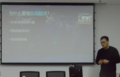 2020级硕士生李喆、2019级硕士生于浩东进行了新闻网站翻译工作的经验分享。李喆介绍了翻译工作团队的工作流程,基于过去的经验教训,他强调了在线术语表在团队翻译中的重要作用。于浩东以“如何做好新闻翻译”为题,从新闻标题的处理、时态处理、机构名称翻译等方面进行分享,并为同学们现场演示了词语搭配查询网站的使用方法。