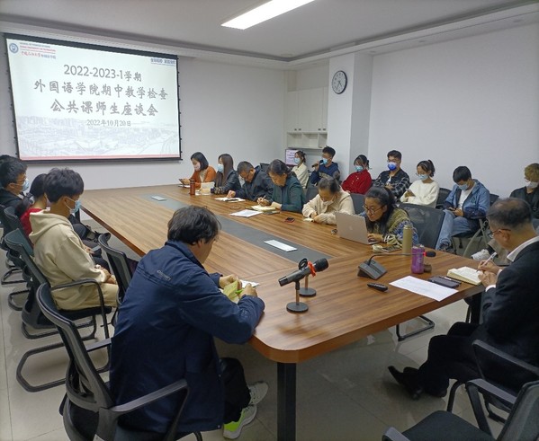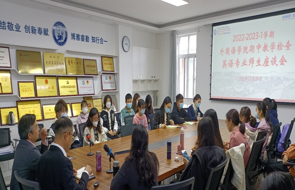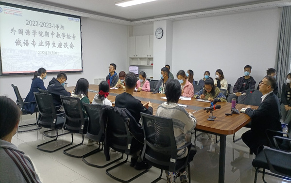 2022年10月20日下午,欧冠直播官网于文理楼346举行2022-2023-1学期期中教学检查师生座谈会。欧冠直播官网院长毛浩然教授、各系部负责人、骨干教师、辅导员、教学秘书、学生代表参加会议。会议由张建科副院长主持。此次座谈以外语课程教材使用情况调研为主题,兼顾学生学习外语的困惑、教师授课情况等方面。学院采取了分期分批的方式,分别听取了英语专业、俄语专业、公共课及选修课学生代表的意见和反馈。