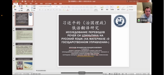 为提高俄语学生的翻译水平,2023年9月23日19:00-21:00,山东省与“一带一路”沿线国家合作研究中心系列讲座第一期在腾讯会议顺利进行(会议号:354-126-067)。本次特邀克鲁格洛夫·弗拉迪斯拉夫·弗拉迪斯拉维奇做题为《习近平的(治国理政)俄语翻译研究》的讲座。参会人员有本院教师、学生及校外学者,共计110余人。