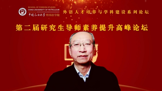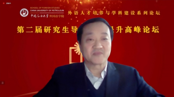教育部高等学校英语专业教学指导委员会委员、中国英汉语比较研究会典籍英译委员会会长、《东北亚外语论坛》主编、河北师范大学李正栓教授以“导师实战引领——彭斯诗群体译者行为研究”为题作主旨报告。李正栓教授从合格导师应具备的特质、导师的立德本质、导师树人的根本任务等方面,强调导师应当无私奉献,忘我指导,乐学生所乐,忧学生所忧。同时,李正栓教授指出导师要要好好讲课,要善于讲课,要科研助课,要培养学生科研意识,提高学生的科研能力,培养学生的职业能力