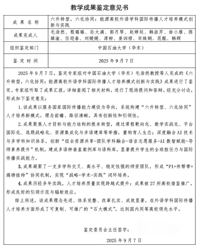 2025年9月3日,鉴定专家组对中国石油大学(华东)毛浩然教授等人完成的《六升转型,六化协同:能源高校外语学科国际传播人才培养模式创新与实践》成果进行了鉴定。专家组听取了成果汇报,详细查阅了相关材料,进行了现场提问和答辩。经充分讨论,形成如下鉴定意见: 一、成果直面国家国际传播战略与外语学科转型的核心痛点,体系设计科学,育人理念领先 该成果精准切中国际传播人才“小才拥挤、大才难觅”和“有理说不清、说了传不开”的现实瓶颈,以服务国家国际传播能力建设为导向,系统构建“六升转型、六化协同”人才培养新体系,实现从“工具性+人文性”向“战略性+科学性”的范式跃升,理念前瞻、战略清晰,具有显著创新性和引领性。 二、“六升六化”机制系统协同,培养路径创新,改革举措扎实 “六升”聚焦人才目标与能力结构的根本转型,突破传统外语人才培养的低阶循环;“六化”通过课程靶向化、教学实战化、平台国际化、选题战略化、资源集成化与多语建库等举措,重构育人生态。尤其在“数智赋能”与“学科融合”方面,深度融合AI技术与多学科知识体系,创新“组会资源共享-团队学科融合-语言志愿服务-AI数智赋能-导师素养提升”机制,建成多语种垂直案例库与语料库,显著提升学生的全球胜任力与国际传播实战能力。 三、实践成效显著,辐射推广广泛,社会服务贡献突出 成果历经多年实践检验,人才培养质量实现跨越式提升:CATTI二级通过率从4.1%提升至28.6%,61人通过4个CSC项目赴海外开展田野调查,30余人进入国际组织实习;建成语言服务博士点及6个省部级平台;研发的孤独症语言障碍干预系统服务超5000人次;“语爱同行”“语医同行”志愿服务获国家级和省级金奖。成果被27所高校借鉴推广,形成良好的引领示范与辐射效应。 四、团队结构优化,协同机制高效,可持续发展能力强 成果凝聚了一支多学科交叉、高水平、稳定性强的师资团队,形成“PI+传帮带+揭榜挂帅”协同机制,依托多个省级科研与教学平台,实现“战略—学术—实践”闭环培养,具备持续发展、推广与迭代能力。 建议进一步加强对国际传播实效的长期跟踪与综合评价,持续优化“六化”协同机制、数智赋能和学科融合路径。 综上所述,该成果理念先进、体系完整、改革扎实、成效显著,在外语学科国际传播人才培养方面形成了可复制、可推广的“石大模式”,达到国内领先水平。专家组一致同意通过鉴定。
