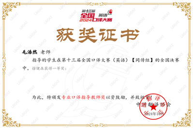 毛浩然. 指导1名学生获第十三届全国口译大赛(英语)【交传组】全国决赛,国家级二等奖,2024年