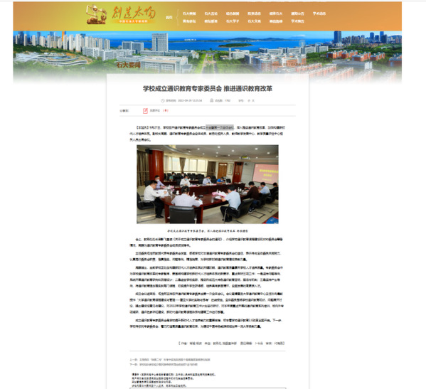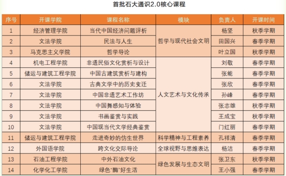 发布《关于深化通识教育提质行动暨开展首批“石大通识2.0”核心课程立项的通知》《关于开展第二批 “石大通识2.0”核心课程立项的通知》。规划分批建设50门左右的高阶高能通识精品课程。学校公布首批“石大通识2.0”核心课程立项名单,立项课程30门,人文艺术与文化传承模块课程7门,科学精神与工程素养模块8门,全球视野与思维表达模块3门。